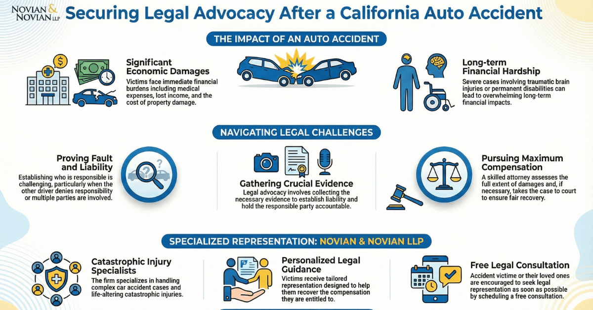 If you or a loved one has been injured in a car accident, it is best to seek legal representation as soon as possible. Our experienced attorneys at Novian & Novian specialize in handling car accident cases and catastrophic injuries. We offer personalized legal guidance and representation to help accident victims recover fair compensation. Schedule a free consultation with us today!