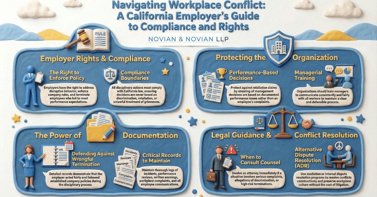 As Sean Bozarth, Senior Counsel at Novian & Novian, explains: “A disgruntled employee isn’t always someone acting maliciously, but often an employee who feels their concerns are being ignored. The key for employers is to address issues early, document incidents, and follow a clear process that complies with California employment law.”